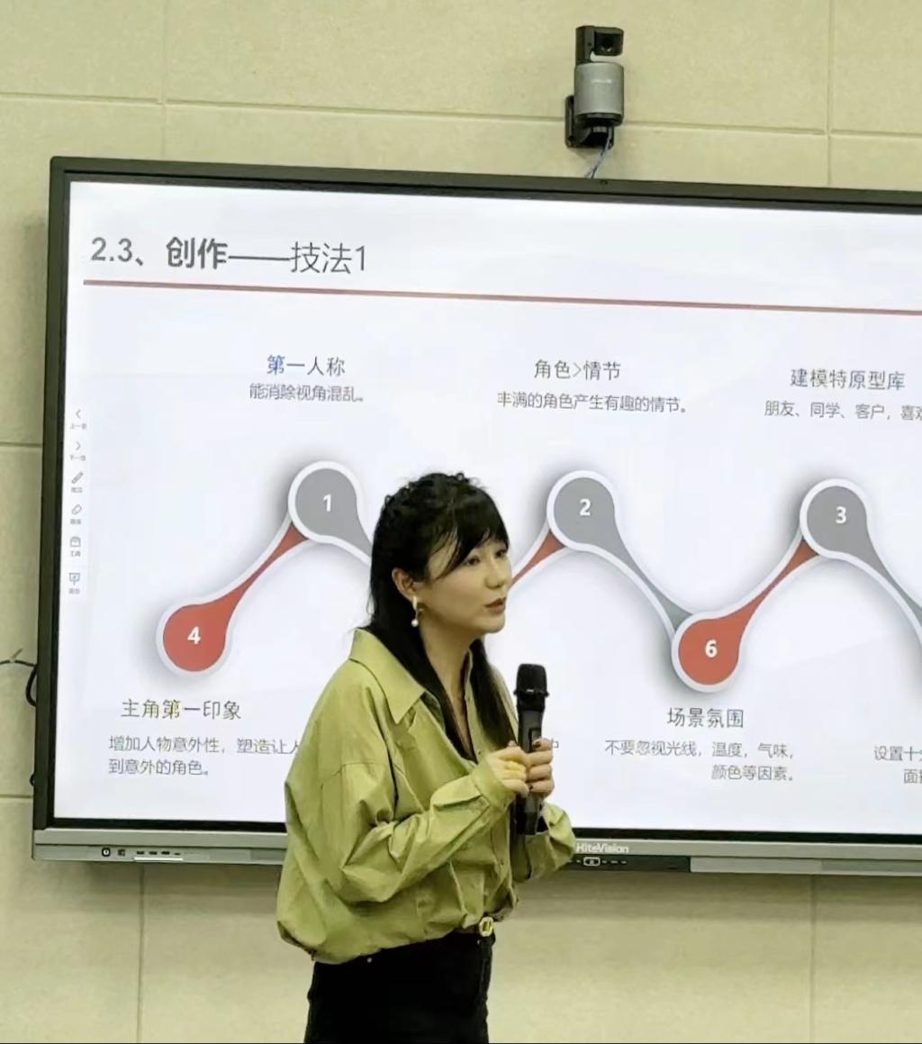 吕丽老师由自己的亲身经历开篇,点出普通人网文创作的形态、平台以及大家最关心的如何变现的问题。内容是生产力的时代,人人都是参与者和创造者。好小说是设计出来的,因此培养网络短篇小说创作思维尤为重要。吕丽老师将自己长期从事短篇小说创作积攒的经验毫无保留的分享给同学们:首先要根据自己的需要、读者的喜欢、顾客的需要、市场的需要进行前期调查;其次,在准备阶段时要编写提纲、制定日程以及调研修正;最后,在创作创作过程中得讲究技法与步骤。满满的干货同学们受益匪浅。