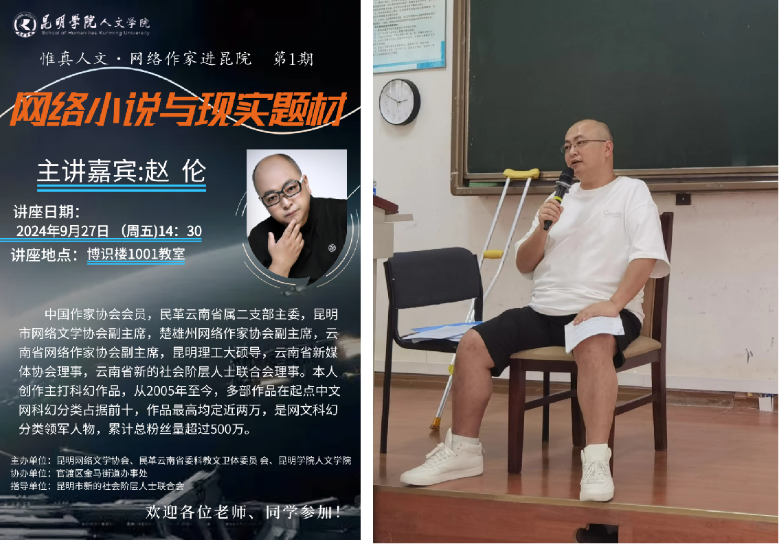 2024年9月27日,由mjm世界杯官网承办的“惟真人文·网络作家进昆院”系列讲座第一期在博识楼1001教室举行。第一期讲座由赵伦(黑天魔神)老师主讲。赵伦老师是中国作家协会会员、民革云南省属二支部主委、昆明网络文学协会副主席,也是“昆明市网络作协作家进校园”公益讲座活动的发起人,已经连续多年组织昆明网络文学协会作家到全省各大中小学开展公益讲座,积极推动云南网络文学的创作和推广。
