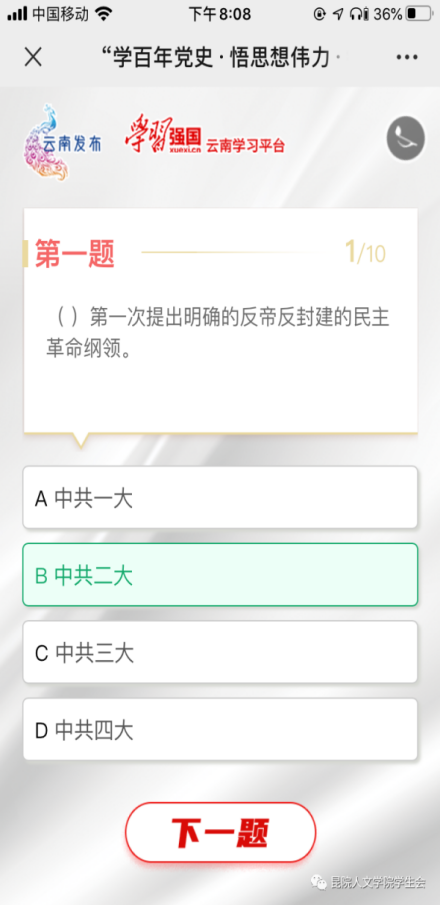 此次互动学习需先关注“云南发布”微信公众号,进入主页点击菜单“学党史”进入答题页面,点击开始答题,选择“中共云南省委教育工委”,提交成功后正式答题。