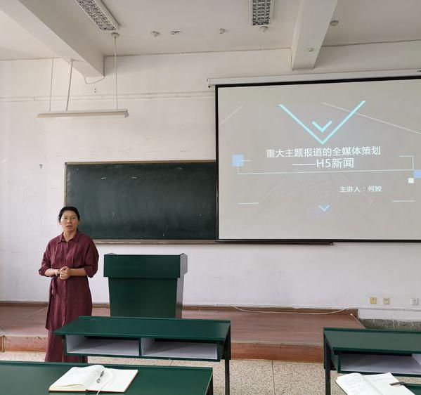 第六位上场的是何姣老师,主讲“重大主题报道的全媒体策划——H5新闻”。