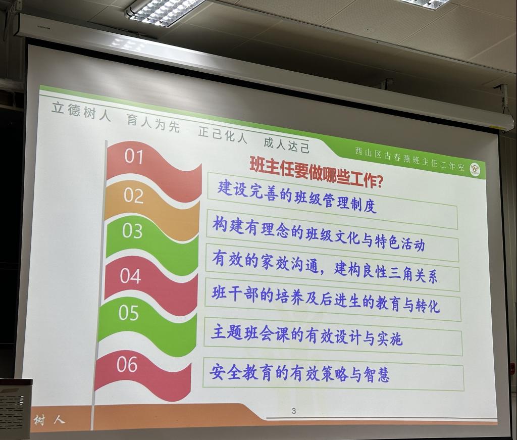 接着,古老师从“建设制度,管理班级”“构建有理念的班级文化与特色活动”“有效的家校沟通,建构良性三角关系”三个方面开展班主任工作经验分享。