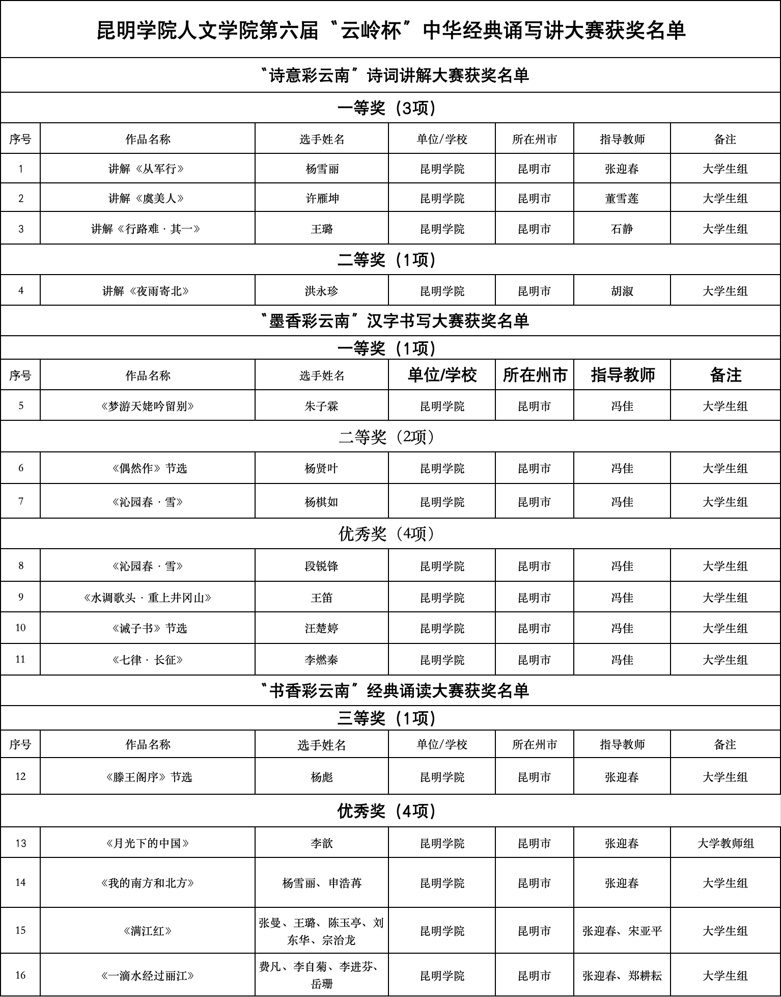 在“诗意彩云南”诗词讲解大赛中,杨雪丽、许雁坤和王璐同学分别凭借对《从军行》《虞美人》和《行路难·其一》的精彩讲解,荣获一等奖。洪永珍同学对《夜雨寄北》的讲解则获得二等奖。