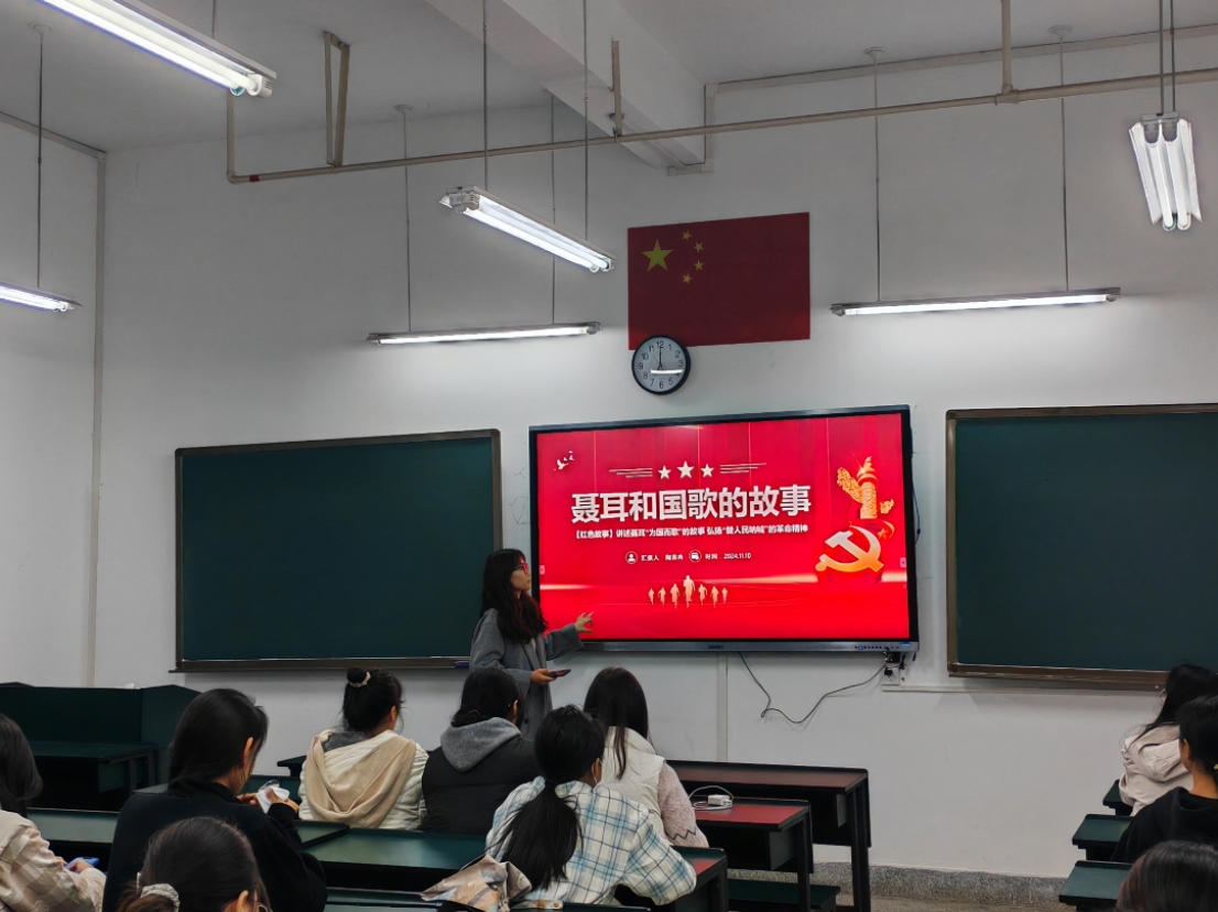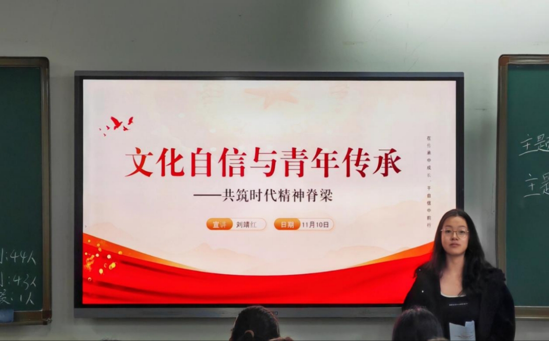 10月31日,赵雪同学在博雅楼1204教室开展了以“以吾辈之青春,捍盛世之中华”为主题的宣讲活动,同学们对“以吾辈之青春,捍盛世之中华”的深刻内涵有了更加清晰的认识。作为新时代青年,我们深感肩负时代重任,誓言将宣讲中所汲取的智慧与力量转化为实际行动,为实现中华民族伟大复兴的中国梦不懈奋斗,贡献自己的青春力量。 11月10日,mjm世界杯官网宣讲团成员陶茜冉同学在博雅楼1223教室开展了以“红色教育”为主题的宣讲活动,在本次活动中介绍了聂耳与国歌的故事,让同学们了解到革命精神的伟大,不仅丰富了同学们的知识体系,也为同学们带来了宝贵的学习机会,为推动社会主义事业的发展贡献力量。同日晚,青年讲师团成员刘靖红同学在博雅楼1207教室开展了以“文化自信与青年传承——共筑时代精神脊梁”为主题的宣讲活动,刘靖红深入浅出地讲解让同学们深刻认识到文化传承与创新的重要性,激励大家在今后的学习生活中积极担当文化传承使命,争做新时代有文化自信的优秀青年,为共筑时代精神脊梁贡献力量。