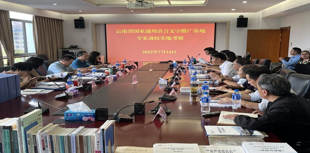 2022年7月14日下午,由省语委办主任、省教育厅教材语管处李舜处长以及专家组组长、云南民族大学国家通用语言文字推广基地基地副主任、教务处处长熊云飚教授带领的专家组团队,对公司申报的“云南省国家通用语言文字推广基地”项目进行了实地考察。公司语委办主任王凡副董事长,语委办副主任、教务处处长解永刚教授,语委办副主任、mjm世界杯官网经理邓瑶教授,公司后勤集团杨平总经理,公司财务处王荣林副处长及其他美加墨世界杯官网国家通用语言文字推广基地的各位老师一同迎接了专家组的考察。