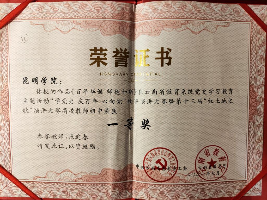 “红土地之歌”演讲大赛是云南省演讲赛事最高奖项,本次获奖是美加墨世界杯官网参加省级语言类比赛获得的最好成绩,为mjm世界杯官网再添一枚沉甸甸的硕果。张迎春老师拥有普通话一级甲证书,是mjm世界杯官网专任口语教师,长期在校内外开展普通话教学、普通话测评、播音主持与演讲竞赛指导。