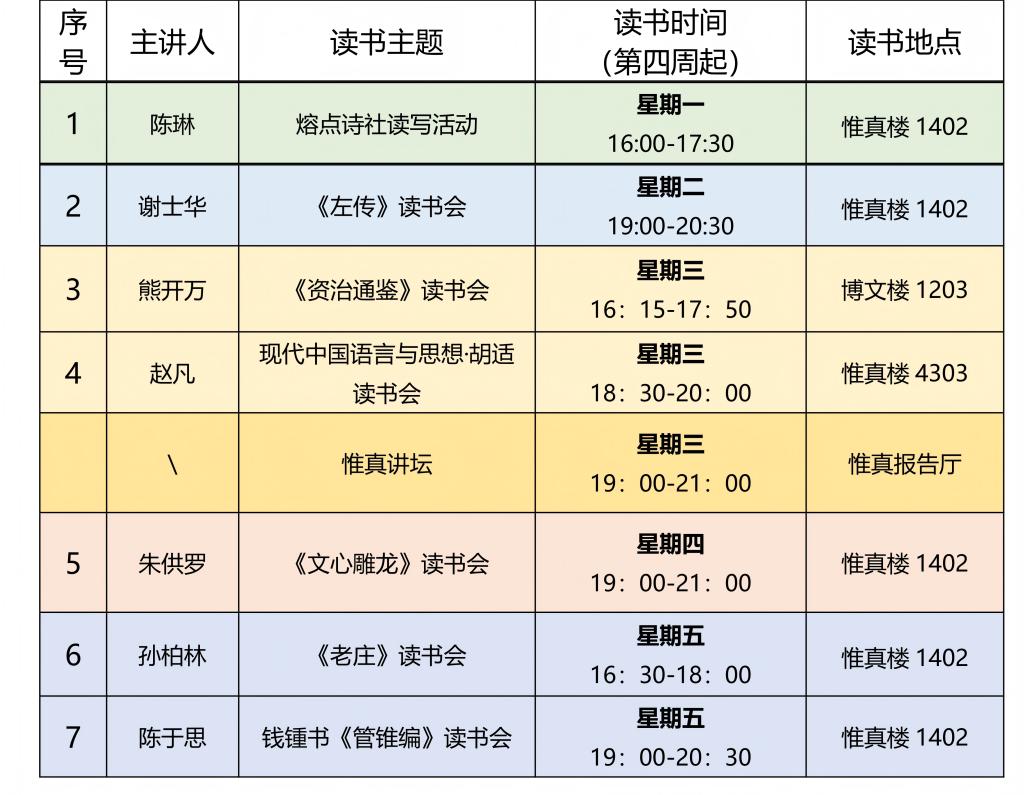 mjm世界杯官网2025秋季学期“惟真•人文读书会”安排如下: