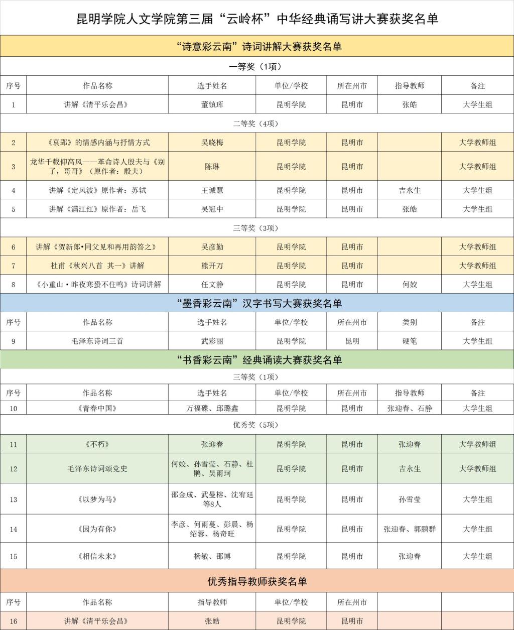 根据《教育部办公厅关于举办第三届中华经典诵写讲大赛的通知》(教语用厅函〔2021〕2号)要求,2021年5月,云南省教育厅、云南省语言文字工作委员会启动了第三届“云岭杯”中华经典诵写讲大赛系列活动,云南出版集团、云南艺术公司、云南财经大学、昆明信息港具体承办。本次比赛共收到经各地各校选拔的880个经典诵读视频、627个诗词讲解视频和6044个汉字书写作品。经专家评审,共评选出经典诵读类拟获奖作品876个,诗词讲解类拟获奖作品544个,汉字书写类拟获奖作品479个,优秀指导教师奖93个,优秀组织单位奖33个。在本次比赛中,公司师生取得了突出成绩,分别获得“墨香彩云南”书写大赛一等奖1项,“诗意彩云南”诗词讲解大赛大学教师组二等奖2项、三等奖2项,老员工组一、二、三等奖各1项。同时,张皓老师获得优秀指导教师奖。获奖名单如下: