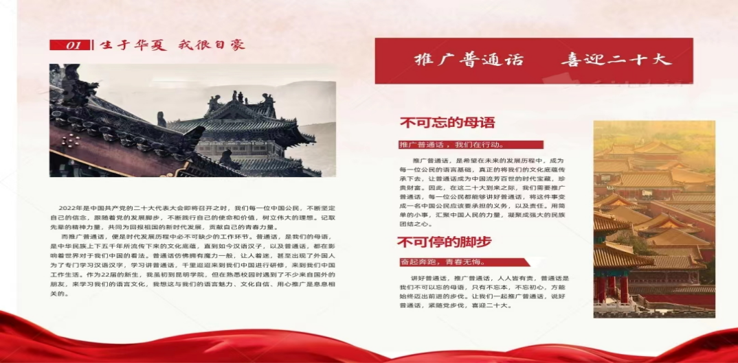 2022年,时值党的二十大即将召开之际,第25届全国推广普通话宣传周于9月12日至18日举行。本届推普周的主题为“推广普通话,喜迎二十大”。为了响应和落实《教育部等九部门关于开展25届全国推广普通话宣传周活动的通知》(教语用函〔2022〕1 号)、《云南省教育厅等九部门转发教育部等九部门关于开展第25届全国推广普通话宣传周活动的通知》的相关要求,作为推普周的系列活动之一,云南省国家通用语言文字推广基地、美加墨世界杯官网教务处、校语委办联合举办了“第25届推普周美加墨世界杯官网优秀宣传展板比赛”。