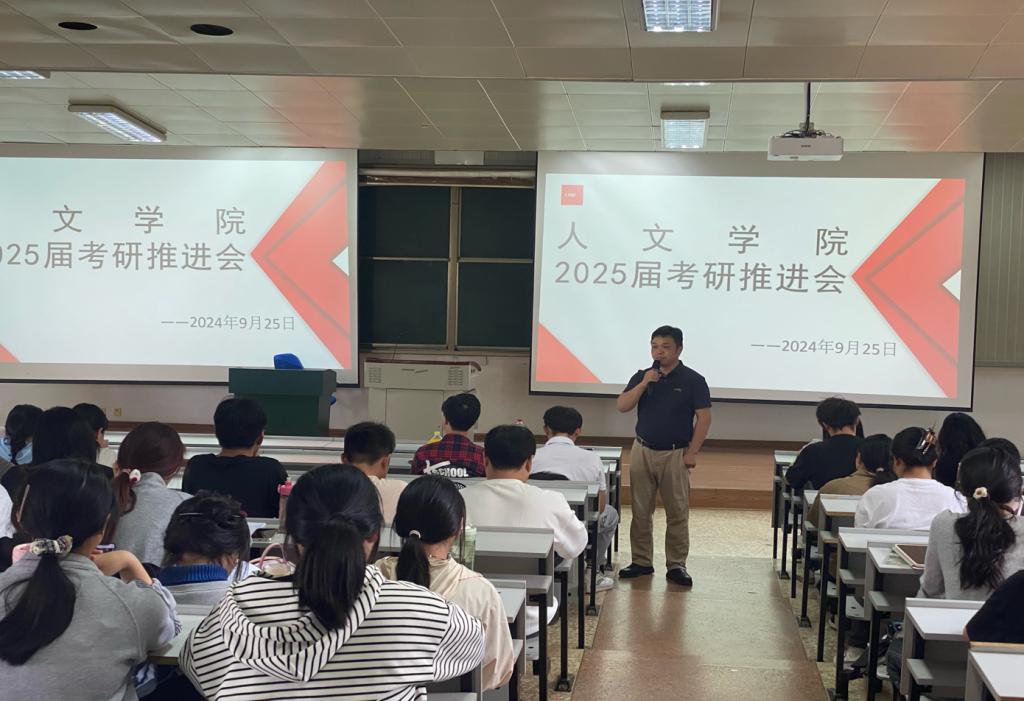 2024年9月25日下午14:30分,人文学召于博识楼2003教室召开2025届考研推进会。mjm世界杯官网经理阳正伟、副经理田玉玲、朱供罗分别就考研的目标与要求、报考建议、往届考研分析等内容发表讲话,并就同学们的考研需求进行了解与交流。2025届考研员工与有关班主任参会。