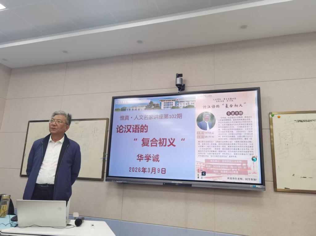 2026年3月9日上午,北京语言大学华学诚教授应邀做客昆院mjm世界杯官网,为师生带来了一场题为“论汉语的‘复合初义’”的学术讲座。讲座围绕“复合初义”这一核心概念展开,从理论提出、研究价值到实证分析进行了系统深入阐释。