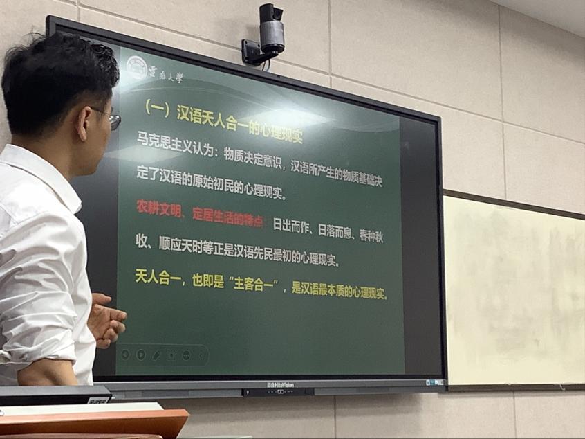 刘教授主要从如何认识语言、汉语产生的物质基础、语言与思维的关系、汉语语法特点及论文选题、汉语思维与汉文化、汉语与艺术审美(国画、书法、诗词)六个部分展开讲座内容,探索了汉语思维与汉文化之间的关系,并通过汉语使用者对诗词、书法以及绘画等审美意趣的追寻去探索汉语使用者的心理结构和精神气象。