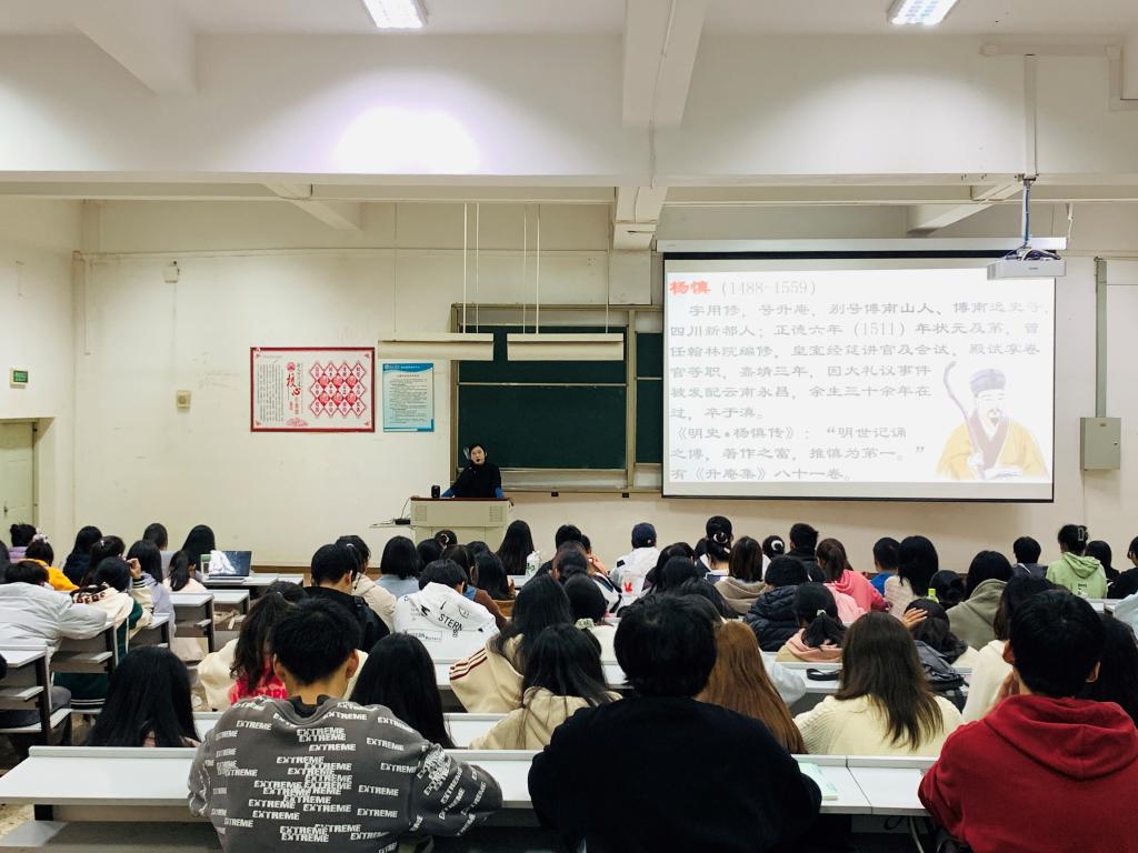 董雪莲老师从杨慎生平讲起,详述了杨慎因“大礼议”事件触犯龙颜、遭廷杖后被贬云南永昌的经过。通过董老师声情并茂的讲解,同学们被杨慎作为儒士为了坚持信仰虽“虽九死其犹未悔”的精神所感动,也对杨慎及其作品产生了浓厚的兴趣。