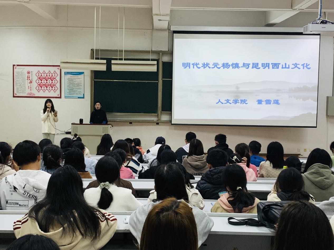 接着,董老师谈到杨慎与西山的关系。董老师以西山为切入点,管中窥豹,讲述了杨慎谪居西山后的经历及其他对西山文化做出的卓越贡献。民风淳朴、风景优美的西山为杨慎提供了身心的栖息之所,杨慎在西山这个“世外桃源”里从事文学活动和创作,留下了许多传世佳作,西山也因为杨慎对其的书写声名远播。董老师带领同学们赏析了杨慎为西山所写的《秋夕高峣早起》、《宿华亭寺》二首、《折桂令·高峣西眺》等诗词,让同学们领略了这位谪状元的卓越才华,深刻体会到他为昆明西山所增添的丰富的人文情韵和深厚的文化内涵。