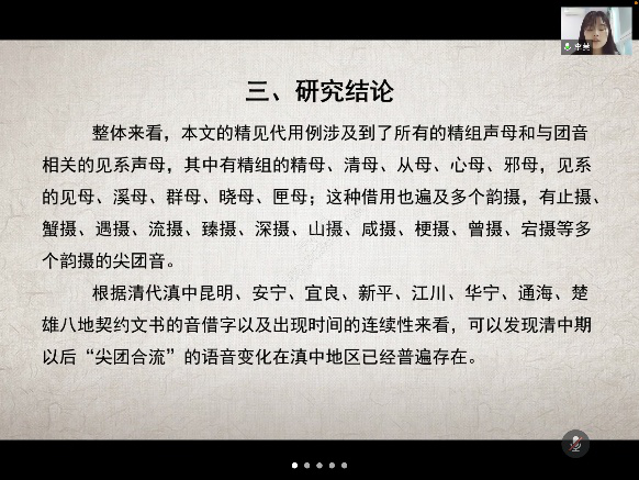 22日上午10点30分,第四场分组报告以线上会议的形式准时开展。报告人为论文的第二作者李莞同学,她从研究现状、研究材料、研究结论和研究意义四个方面对论文进行了简要介绍,向参会人员阐述了清代滇中汉语方言“尖团合流”的语音发展情况。