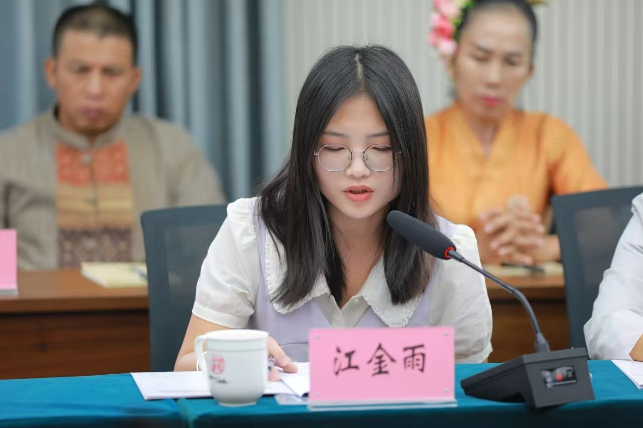 座谈会上,公司研究生导师、云南省民族艺术研究院一级文学编辑、云南当代文学研究会副会长王红彬教授对康朗甩的诗歌作品进行探究,作了关于铸牢中华民族共同体意识的发言。公司2022级中国少数民族语言文学方向研究生江金雨同学从康朗甩的人生经历出发,作了关于爱国情怀、边疆发展和民间文学传承的发言,公司2023级中国少数民族语言文学方向研究生曹芮同学从康朗甩的文学创作和文学作品出发,作了关于唱响民族团结的时代之歌的发言。