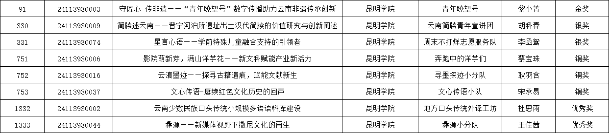其中孙雪莹老师指导的《守匠心,传非遗——“青年瞭望号”数字传播助力云南非遗传承创新》项目斩获国家金奖,李烨老师的《简牍述云南——晋宁河泊所遗址出土汉代简牍的价值研究与创新阐述》喜获国家银奖,李歆老师指导的《文心传语一庚续红色文化历史的回声》、《影院萌新芽,满山洋芋老新文科赋能产业新活力》和熊开万老师指导的《云滇墨迹--探寻古籍遗痕,赋能文献新生》三个项目荣获国家铜奖。孙雪莹老师获评“优秀指导教师”。