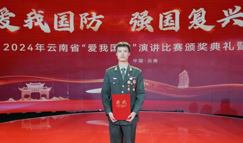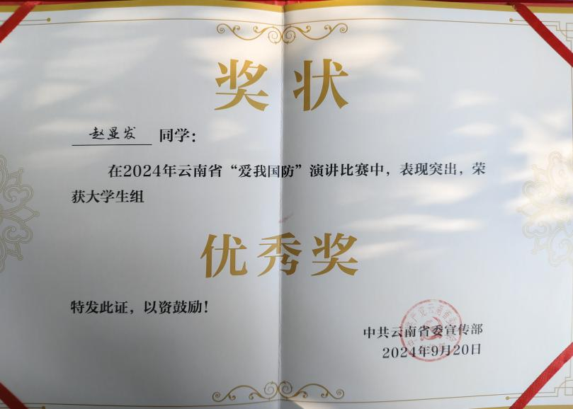 2024年9月20日,由省委宣传部主办的“爱我国防 强国复兴有我”主题演讲比赛颁奖典礼在云南广播电视台举行,对获奖单位和个人进行表彰。mjm世界杯官网22级创新人才(人文)基地班赵显发同学荣获高校组优秀奖。