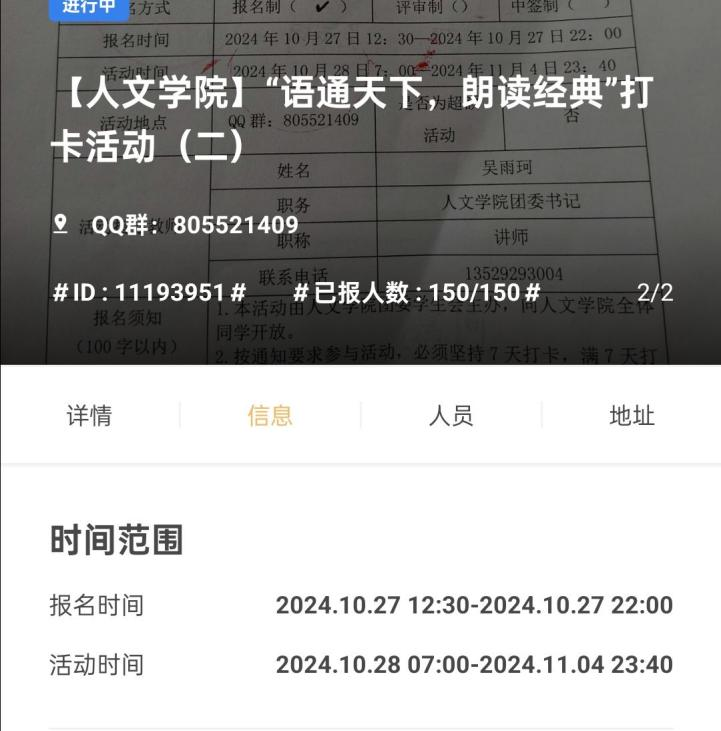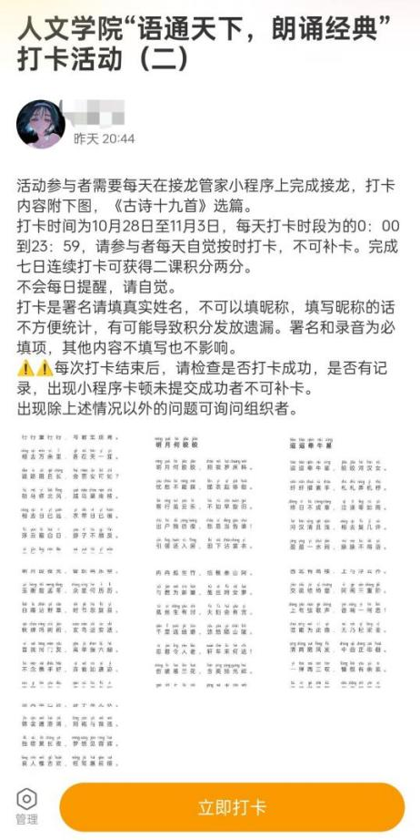 两期“语通天下,朗读经典”朗诵打卡活动分别于10月14日、10月28日举行。同学们都积极报名参与,每日按时按质完成《诗经》和《古诗十九首》的朗读打卡任务。