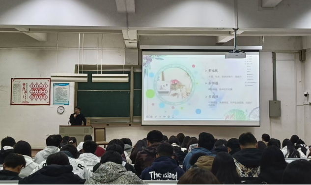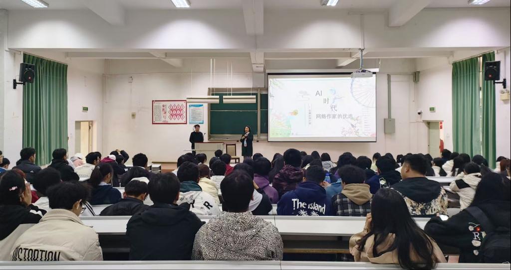本次讲座主题为“AI时代,网络作家的优选”,徐老师从个人的创作经历、网络文学发展现状谈起,分析了网络文学的多元化、多渠道、多选择等特点,为大家讲解AI辅助写作的主要功能、重要作用,并同学们推荐了起点等重要的网络平台,为同学们的写作与作品发表做了重要推介。讲座内容丰富,生动鲜活、风趣幽默、,深深地吸引了参会的同学。