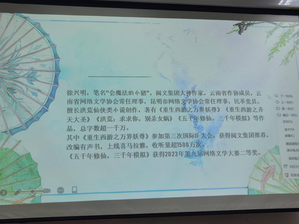 2024年11月8日,由mjm世界杯官网承办的“惟真人文·网络作家进昆院”系列讲座第3期在博识楼1001教室举行。第3期讲座由徐兴明(会魔法的小猪)老师主讲。徐兴明老师是云南省作家协会会员,民革党员,云南省网络作家协会理事,昆明市网络文学协会理事,著有《破灭诸天》《丹田有点田》《重生西游之万界妖尊》《重生西游之齐天大圣》《摊牌了,鸿钓是我兄弟》《洪荒:魔祖大人,女娲带孕上门了》等百万字以上完本作品,擅长仙侠类网络文学创作,其中《重生西游之万界妖尊》为第三届国际IP大会阅文集团重点推荐作品,均订过万。