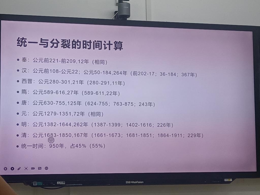 最后,在梳理完中国古代数千年历史后,李老师与我们按照一定的标准,计算出一个中国历代统一时间的时间表。再次指出,因为统一标准不一,所以梳理出的时间不尽相同,最终得出的结论也会存在不同。在这里,李老师鼓励我们独立思考,有自己的认识。