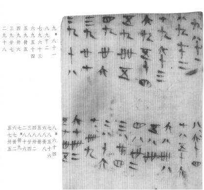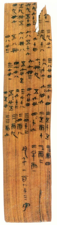 目前最早的乘法口诀简牍,系用战国楚系文字书写而成,出土于楚故都纪南城遗址约1公里的秦家咀墓地。秦简、汉简中有多批次成套的口诀表。出土乘法口诀表,往往从大数起,始于九九八十一,没有我们熟悉的一一得一,个别简牍上反而多出了“二半而一”。这一套口诀表,可称为小九九。